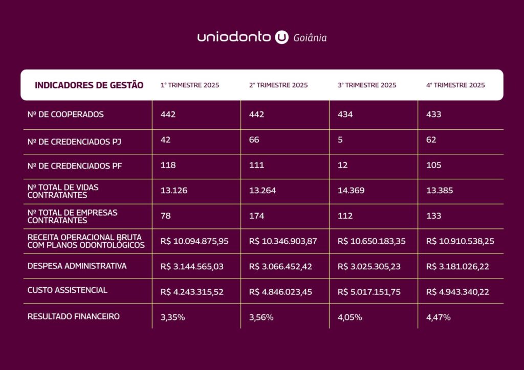 A Uniodonto Goiânia disponibiliza para os seus cooperados o balanço do 4º trimestre de 2025. Os dados divulgados demonstram os resultados positivos alcançados pela gestão, que tem atuado de forma proativa para assegurar os avanços da cooperativa, reafirmando os seus valores e compromisso com os cooperados. Foram mais de 13 mil beneficiados pelos planos de atendimento odontológicos da cooperativa, que obteve faturamento bruto superior a R$ 10 milhões.