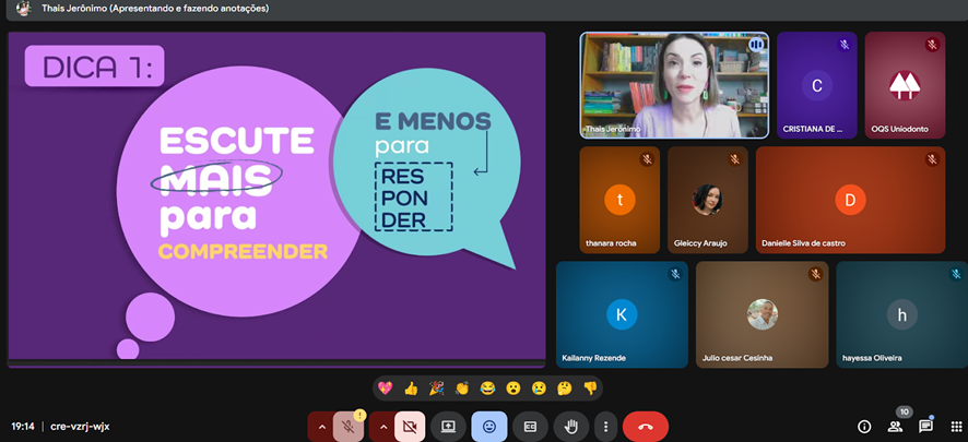 Entre as técnicas valiosas, ela destacou a importância de “escutar mais para compreender e menos para responder”. A organização da comunicação para evitar improvisos com modelos prontos, revisão para não enviar texto com erros ortográficos e o respeito aos horários de expediente tiveram destaque. Outro ponto importante citado para uma boa comunicação via WhatsApp foi a linguagem cordial, objetiva e sem áudios longos.