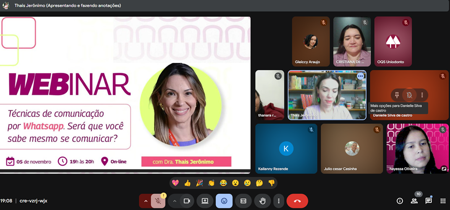 A Uniodonto Goiânia realizou, na última quinta-feira, dia 05 de novembro, um webinar para secretárias e secretários sobre técnicas de comunicação por WhatsApp. A experiente consultora Thaís Jerônimo ministrou a palestra com transmissão online e destacou a importância de aprimorar a comunicação para ampliar a boa relação com os pacientes, beneficiários da cooperativa.